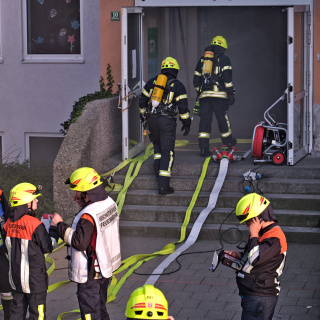 Der Löschzug der Feuerwehr Grassau führte sofort den Erstangriff durch, mehrere Trupps drangen unter schwerem Atemschutz im Innenangriff zur Menschenrettung und Brandbekämpfung ins Gebäude vor. Flure und Klassenzimmer im Erdgeschoß wurden ebenso durchsucht wie der verwinkelte Keller mit seinen Technik- und Lagerräumen. Die Belüftung des Eingangsbereiches wurde vorbereitet, gleichzeitig entstand die Wasserversorgung für die eingesetzten Angriffstrupps.